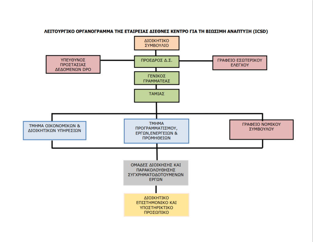 Για την υλοποίηση των συγχρηματοδοτούμενων έργων μέσω της εταιρείας Διεθνές Κέντρο για τη Βιώσιμη Ανάπτυξη (ICSD), εμπλέκεται η Διεύθυνση Διοικητικού Οικονομικού, το Τμήμα Προγραμμάτων και Προγραμματισμού, το Τμήμα Προμηθειών και το τμήμα Λογιστηρίου.